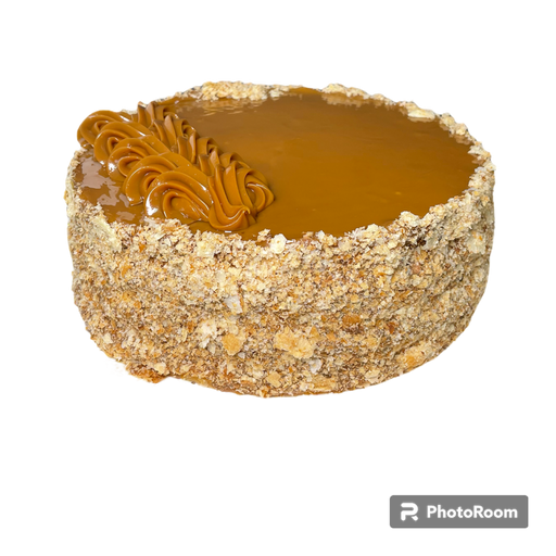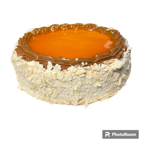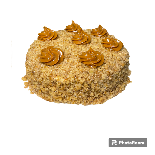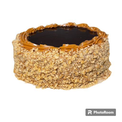 Bizcocho húmedo de chocolate, relleno con crema de trufa y manjar, nueces picadas en los lados, cubierta con ganache de chocolate y terminaciones en manjar.