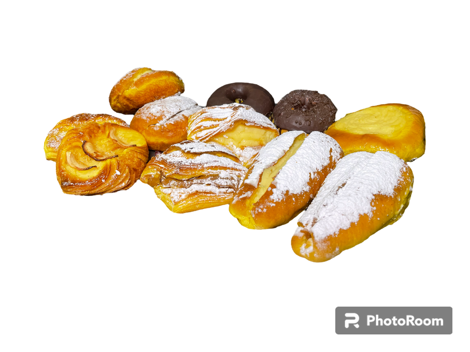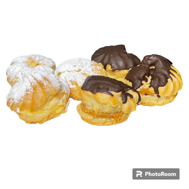 Masa dulce horneada rellena con crema pastelera en el centro.