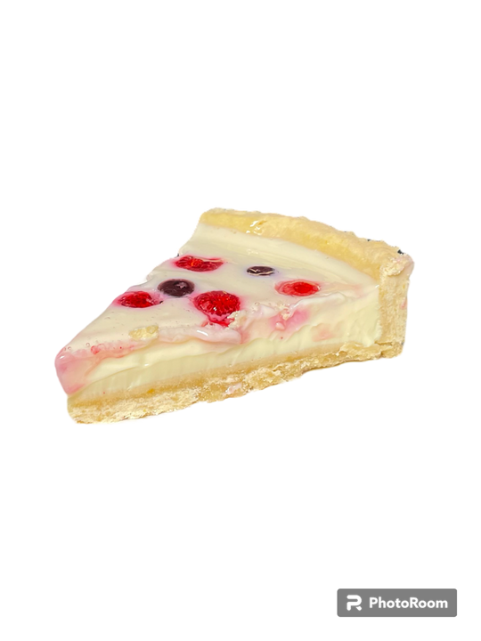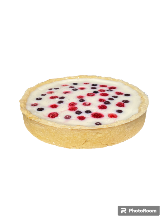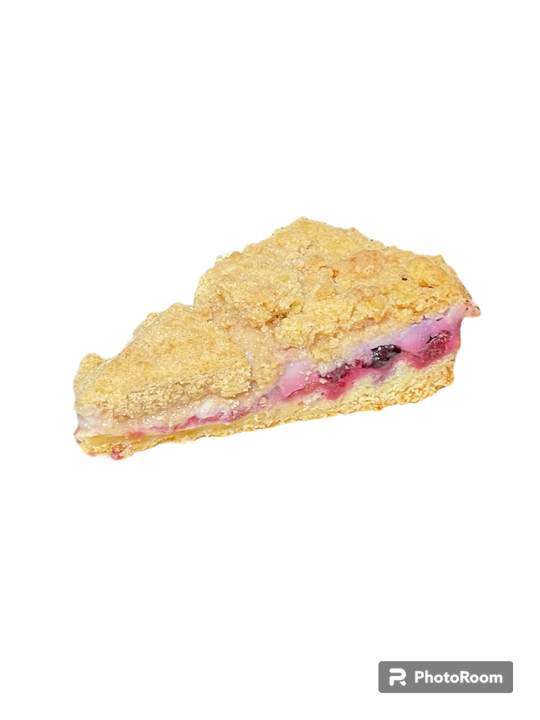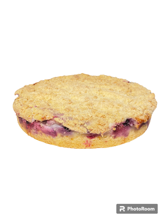 Kuchen del sur chileno a base de mantequilla, relleno con crema de frambuesa y arándano y con miga de mantequilla en la superficie.