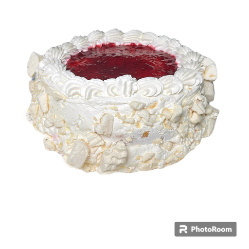 Torta clásica URUGUAYA hecha con Bizcocho, manjar, discos de merengue, crema chantilly y frambuesas naturales, decorada con chantilly y merengue seco.