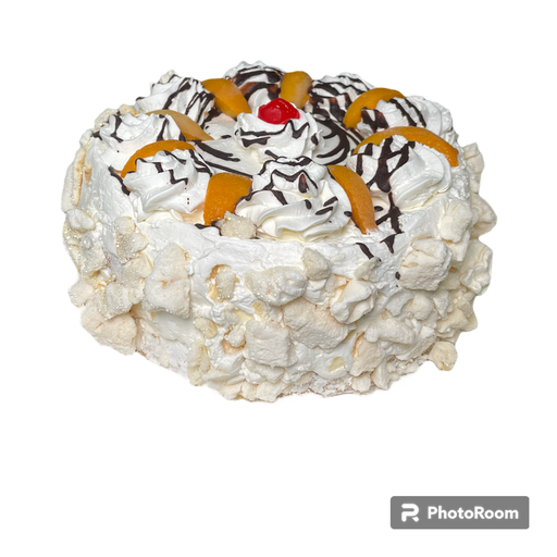 Torta clásica URUGUAYA hecha con Bizcocho , manjar, discos de merengue, crema chantilly y durazno en conserva, decorada con chantilly y merengue seco.