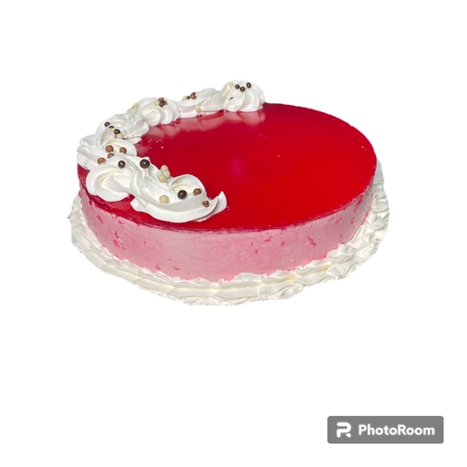 Base de bizcocho, una mezcla de chantilly y yogurt natural de frambuesa y jalea de frambuesa en su cobertura.