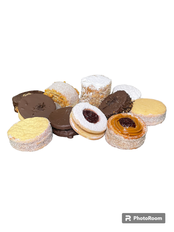 Discos de hojaldre rellenos con manjar, cubierto con azúcar flor.