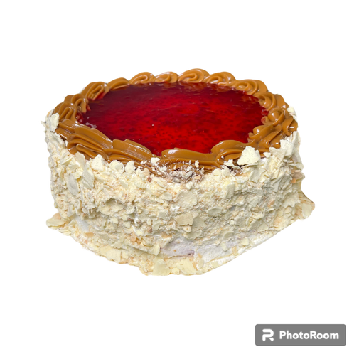 Masa de mantequilla, relleno con manjar, coco rallado en los bordes, cobertura de manjar y mermelada de frambuesa.